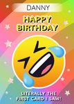 Kleurrijke verjaardagskaart met een lachende emoji en de tekst: 'Happy Birthday. Literally the first card I saw'. Verras iemand met deze grappige verjaardagskaart van Joy Pixels en Danilo.