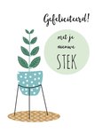Leuke kaart om iemand met zijn of haar nieuwe woning mee te feliciteren op de kaart zie je een leuke kamerplant en de tekst: Gefeliciteerd met je nieuwe stek!