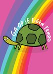 Denken aan kaart met de tekst: Ga op je eigen tempo. Woordspelingen, sarcasme en vreemde dieren. Dat zijn de leuke, vrolijke designs van Katie Abey.