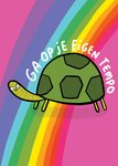 Denken aan kaart met de tekst: Ga op je eigen tempo. Woordspelingen, sarcasme en vreemde dieren. Dat zijn de leuke, vrolijke designs van Katie Abey.