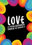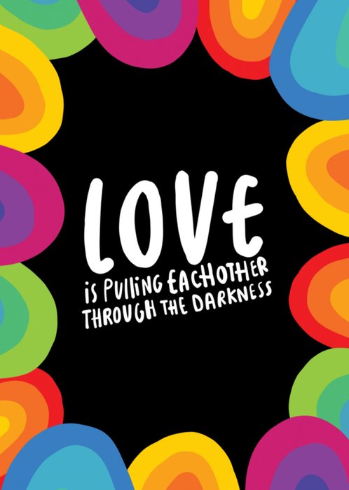 Leuke kleurrijke kaart met de tekst: Love is pulling eachother through the darkness