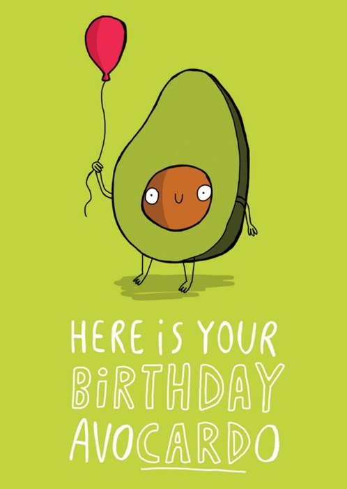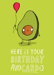 Grappige verjaardagskaart van een avocado met een ballon en de tekst: Here is your birthday avoCARDo