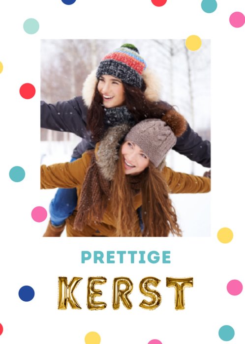 Een vrolijke kerstkaart met gekleurde stippen. Voeg jouw leukste foto toe en onder de foto staat de tekst "Prettige Kerst" deels in goude folieballonnen geschreven.