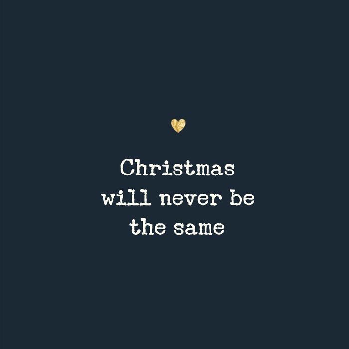 Kerst is voor velen de mooiste tijd van het jaar. Maar als de mooiste dagen voor anderen moeilijk zijn, dan pas je daar je kerstkaart natuurlijk op aan. 'Christmas will never be the same..' De kaart heeft een donkerblauwe achtergrond en boven de tekst een klein goudgeel hartje.
