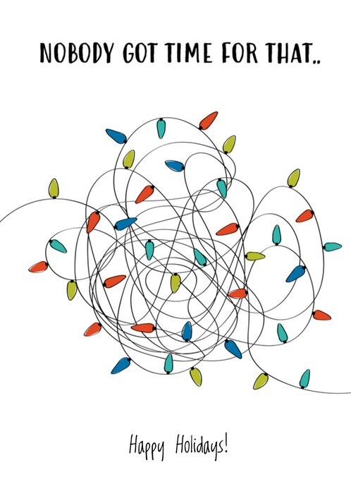 Een humoristische kerstkaart van Greetz. Iedereen kent het wel: de kerstlampjes uit elkaar halen. Op deze kaart zie je kerstlampjes die in elkaar zitten en de tekst: Nobody got time for that....