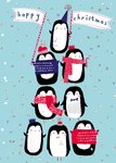 Een mooie kerstkaart met een handgeschreven tekstje: Happy Christmas. Ook zie je een groepje pinguins die op elkaars nek staan.