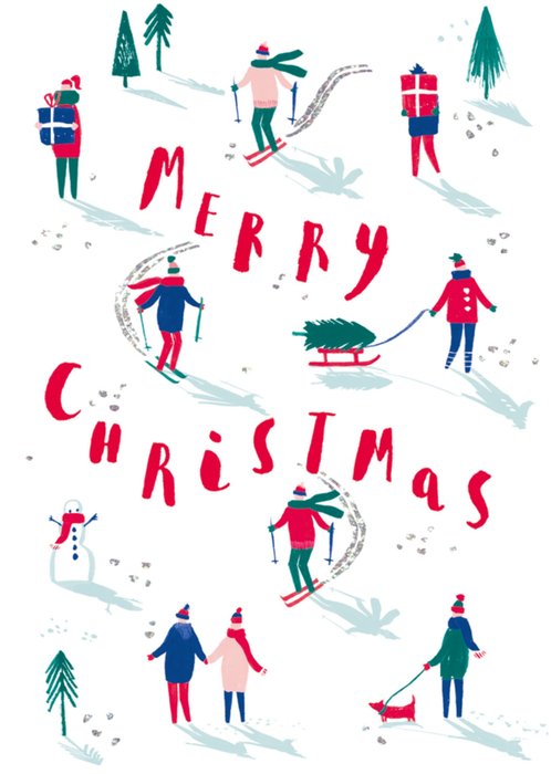 Een mooie kerstkaart met een handgeschreven tekstje: Merry Christmas. Op de kaart zie je een groepje mensen skien.