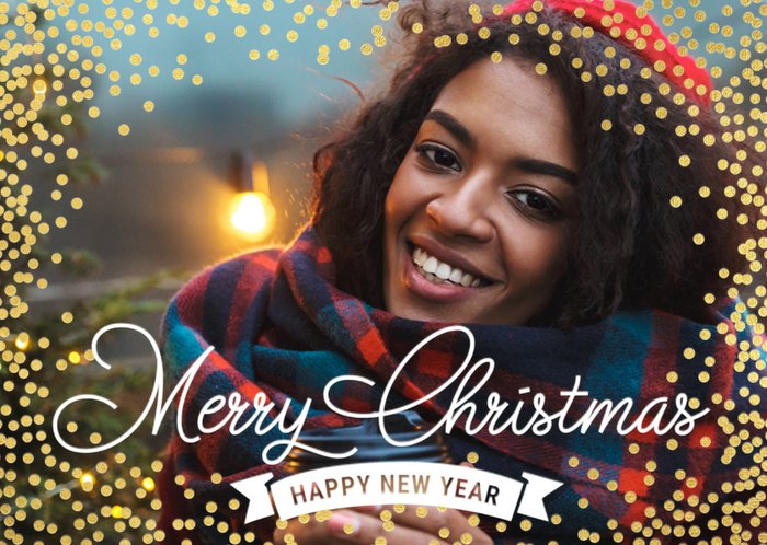 Voeg een leuke foto toe aan deze kerstkaart van Luckz. De rest is versiert met stippen en de tekst: Merry Christmas and a happy new year.