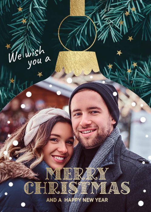 Je kunt op deze kerstkaart een leuke foto toevoegen. Ook staat er de tekst: we wish you a merry christmas and a happy new year.