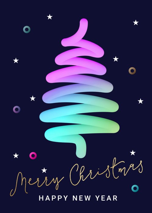 Wat een vrolijke boom! Op deze kerstkaart zie je een neon kerstboom en de tekst: Merry Christmas, Happy New Year.