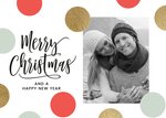 Wens vrienden en familie fijne feestdagen met een leuke fotokaart voor Kerst. Je voegt aan dit design een foto toe en de tekst met namen is aanpasbaar. Om de foto heen zie je gekleurde stippen en de tekst: Merry Christmas and a Happy New Year.