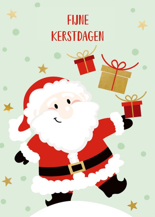 Op deze kerstkaart van TMS zie je een kerstman met pakjes en de tekst: fijne feestdagen.