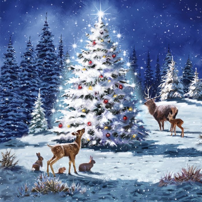 Op deze klassieke kerstkaart van UK Greetings zie je een mooie besneeuwde kerstboom en rendieren.