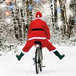 Op deze kerstkaat van UK Greetings zie je een lollige kerstman op de fiets in de sneeuw.