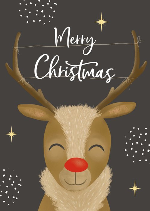 Een lieve kerstkaart met een glimlachende rendier en de tekst: Merry Christmas..