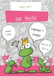 Schattige verjaardagsuitnodiging van TMS, met een kikkerkoning op de voorkant. Maak de uitnodiging extra persoonlijk door een eigen naam op de voorkan toe te voegen.