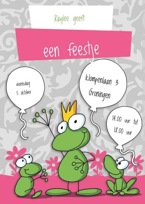 Schattige verjaardagsuitnodiging van TMS, met een kikkerkoning op de voorkant. Maak de uitnodiging extra persoonlijk door een eigen naam op de voorkan toe te voegen.