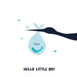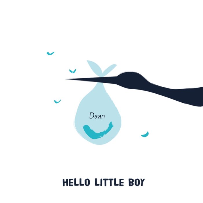 Een lief geboortekaartje om de kersverse ouders van de kleine jongen te feliciteren. Op de kaart houdt een ooievaar de baby op. De naam op de kaart is aanpasbaar. Toch liever een ander design? Bekijk