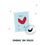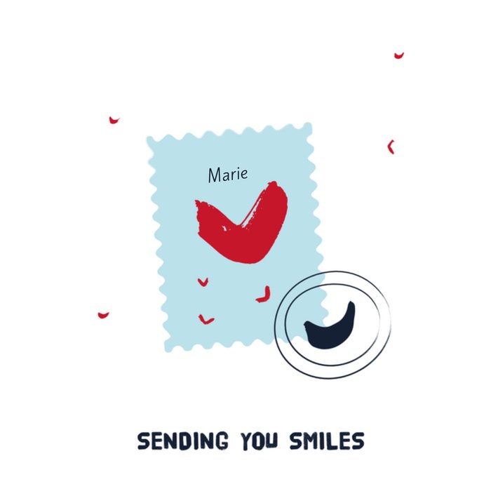 Gewoon zomaar een kaartje met daarop een postzegel en een hartje en de tekst: "sending you smiles." De naam op de kaart is aanpasbaar. Toch liever een ander design? Bekijk