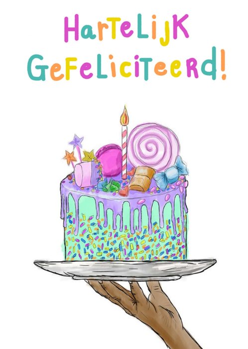 Kleurrijke verjaardagskaart met illustratie van een taart en de tekst: Hartelijk gefeliciteerd!