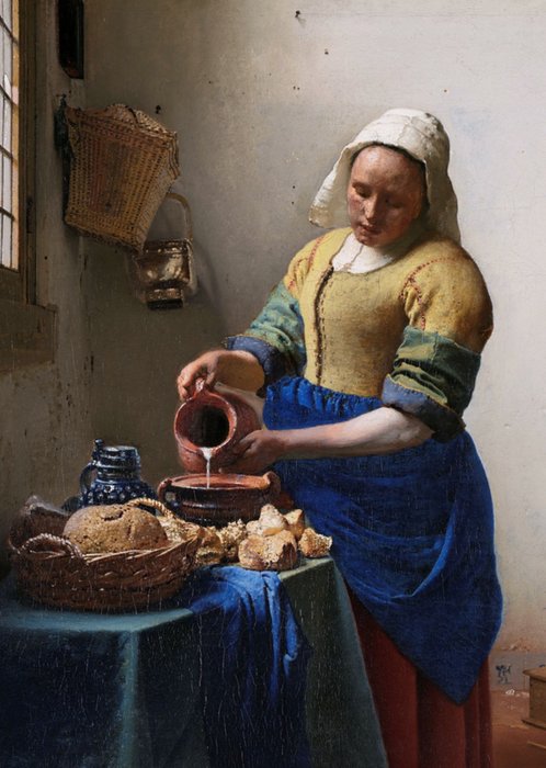 Op deze kunstkaart zie je het schilderij het melkmeisje van Johannes Vermeer. Op het schilderij zie je het meisje dat de melk aan het inschenken is.