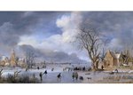 IJsvermaak in een Hollands landschap, geschilderd door Aert van der Neer. Op de kaart staan schaatsers en kolfspelers op het ijs.
