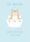 Feliciteer met de geboorte van een kindje met deze lieve geboortekaart van Klara Hawkins. Op de kaart staat een mooie illustratie en de tekst: Een tweeling. Gefeliciteerd.