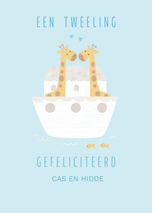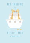 Feliciteer met de geboorte van een kindje met deze lieve geboortekaart van Klara Hawkins. Op de kaart staat een mooie illustratie en de tekst: Een tweeling. Gefeliciteerd.