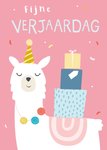 Vrolijke verjaardagskaart met alpaca en de tekst: Fijne verjaardag.