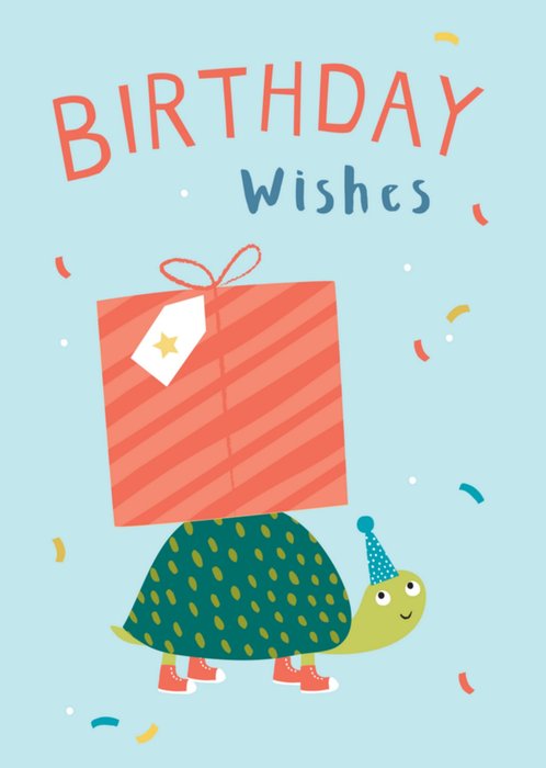 Vrolijke verjaardagskaart met schildpad illustratie en de tekst: Birthday wishes.