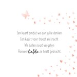 Lieve condoleancekaart met roze harten en de tekst: 'Een kaart omdat we aan jullie denken. Een kaart voor troost en kracht. We zullen nooit vergeten hoeveel liefde ze heeft gebracht.'