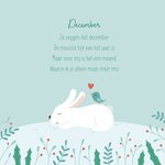Lieve kerstkaart met een konijn, een vogel en de tekst: 'December. Ze zeggen dat december de mooiste tijd van het jaar is. Maar voor mij is het een maand waarin ik je alleen maar meer mis.'