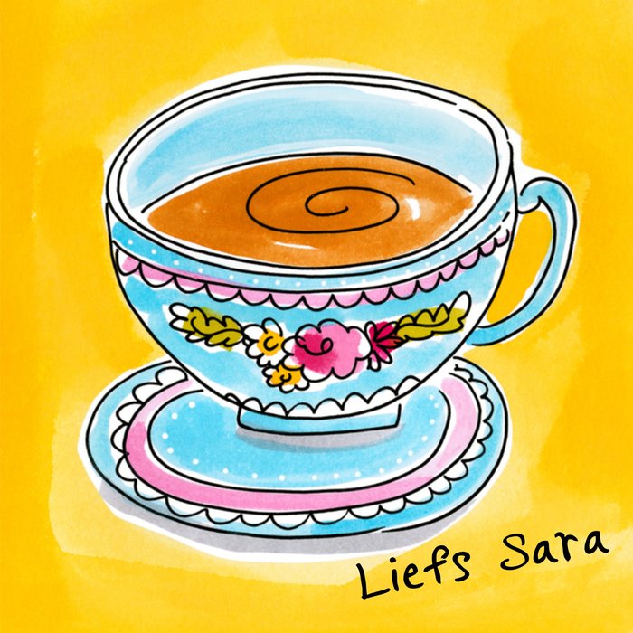 Op deze kaart staat een kopje thee. Ook kun je je naam onder de kaart zetten.