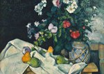 Deze kunstkaart laat een bekend schilderij zien van de kunstenaar Paul Cézanne. Het laat een stilleven zien van een tafel waar fruit en bloemen opliggen.