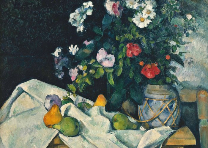 Deze kunstkaart laat een bekend schilderij zien van de kunstenaar Paul Cézanne. Het laat een stilleven zien van een tafel waar fruit en bloemen opliggen.