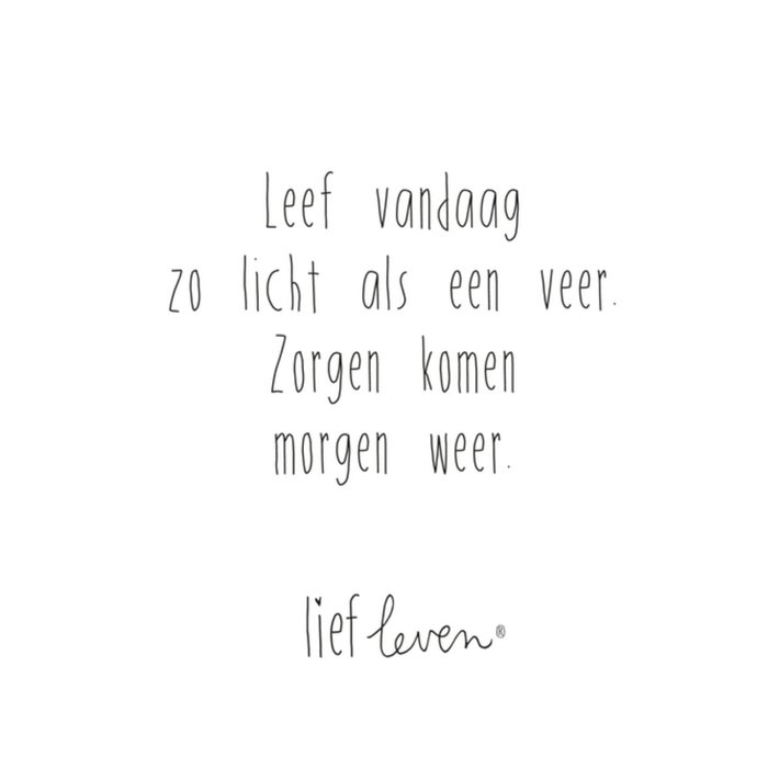 Op deze mooie quote kaart van Lief Leven staat: Leef vandaag zo licht als een veer. Zorgen komen morgen weer.