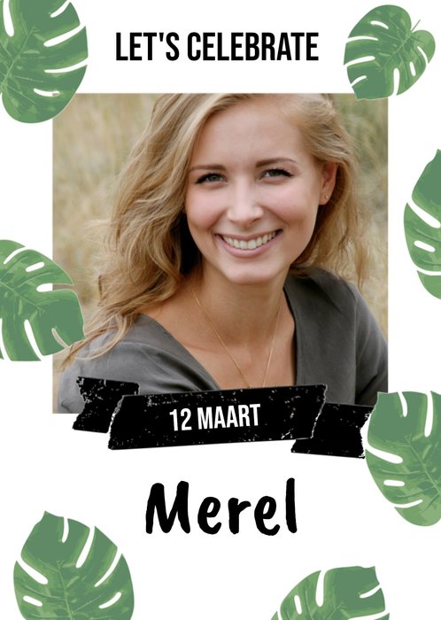 Heb je binnenkort iets te vieren, dan is deze uitnodiging zeker leuk om te versturen naar de genodigden. Plaats een foto op de voorkant van de uitnodiging en pas de datum aan. De uitnodiging kan je nog voorzien van leuke versieringen zoals een knipoog smiley, taart of ballonnen. Op de uitnodiging staat de tekst 'Let's celebrate'.