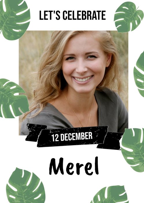 Heb je binnenkort iets te vieren, dan is deze uitnodiging zeker leuk om te versturen naar de genodigden. Plaats een foto op de voorkant van de uitnodiging en pas de datum aan. De uitnodiging kan je nog voorzien van leuke versieringen zoals een knipoog smiley, taart of ballonnen. Op de uitnodiging staat de tekst 'Let's celebrate'.