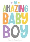 Kleurrijke geboortekaart met aanpasbare naam en de tekst: Amazing baby boy