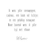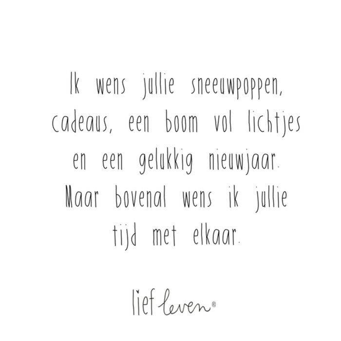 Wie wil jij verrassen met een liefdevolle kaart tijdens de Kerst? Stuur deze lieve kaart van Lief Leven met de tekst: 'Ik wens jullie sneeuwpoppen, cadeaus, een boom vol lichtjes en een gelukkig nieuwjaar. Maar bovenal wens ik jullie tijd met elkaar.'