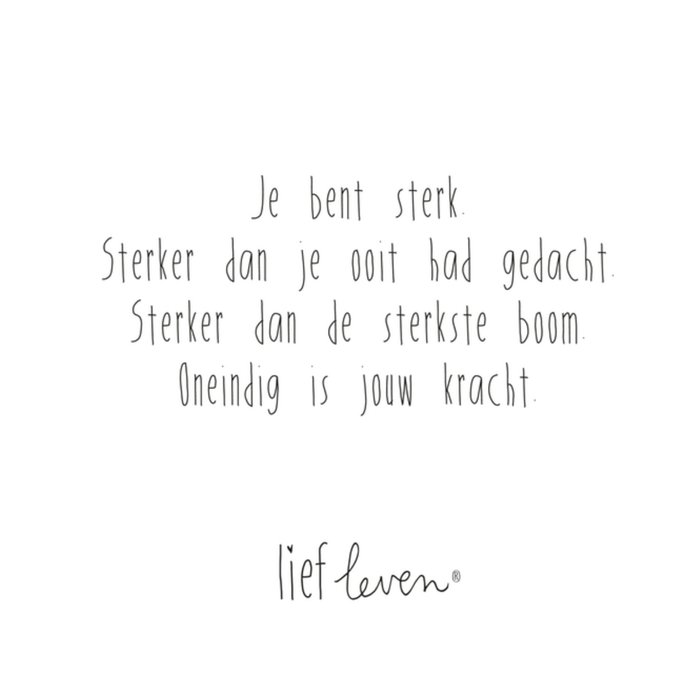 Op deze mooie quote kaart van Lief Leven staat: Je bent sterk. Sterker dan je ooit had gedacht. Sterker dan de sterkste boom. Oneindig is jouw kracht.