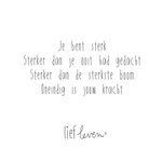 Op deze mooie quote kaart van Lief Leven staat: Je bent sterk. Sterker dan je ooit had gedacht. Sterker dan de sterkste boom. Oneindig is jouw kracht.