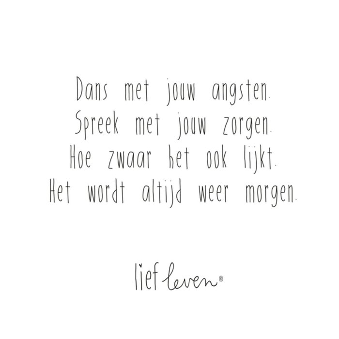 Op deze mooie quote kaart van Lief Leven staat: Dans met jouw angsten. Spreek met jouw zorgen. Hoe zwaar het ook lijkt. Het wordt altijd weer morgen.