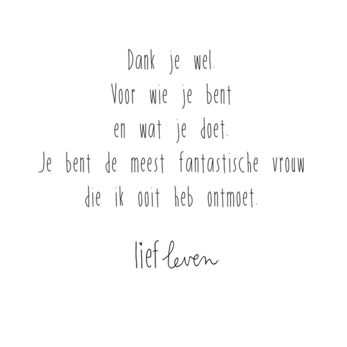 Typografische valentijnskaart met de tekst: 'Dank je wel. Voor wie je bent en wat je doet. Je bent de meest fantastische vrouw die ik ooit heb ontmoet'. Verras je liefde met deze minimalistische valentijnskaart van Lief Leven.