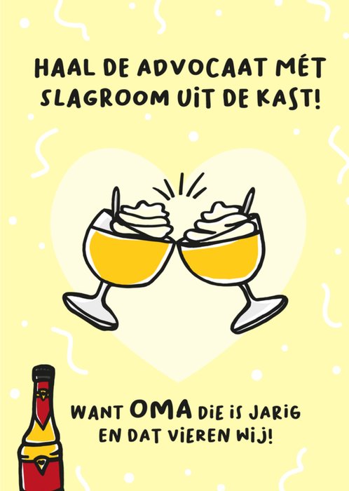 Typografische verjaardagskaart met illustraties van advocaat met slagroom en de tekst: 'Haal de advocaat met slagroom uit de kast! Want Oma die is jarig en dat vieren wij!'. Verras je Oma met deze grappige verjaardagskaart van Liefs Jansje.
