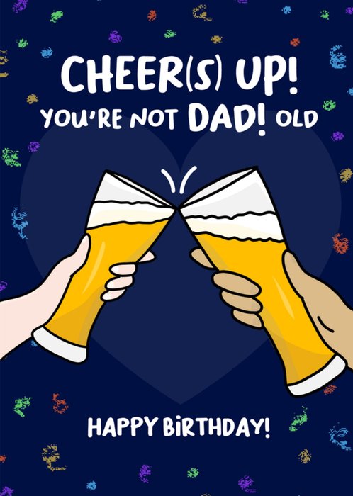 Typografische verjaardagskaart met biertjes en de tekst: 'Cheer(s) up! You're not DAD! Old. Happy Birthday!'. Verras je papa met deze leuke verjaardagskaart van Liefs Jansje.