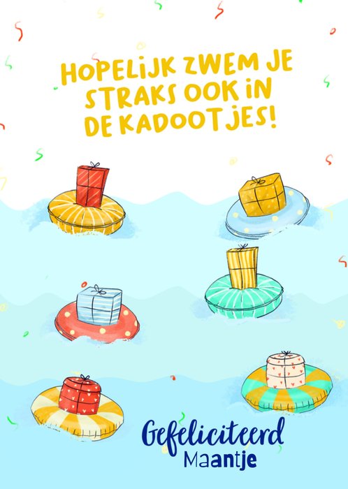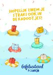 Grappige verjaardagskaart met zwembaden en cadeauthema met de tekst: “Hopelijk zwem je straks ook in de kadootjes! Gefeliciteerd Maantje.” Verras iemand met deze vrolijke verjaardagskaart van Liefs Jansje.