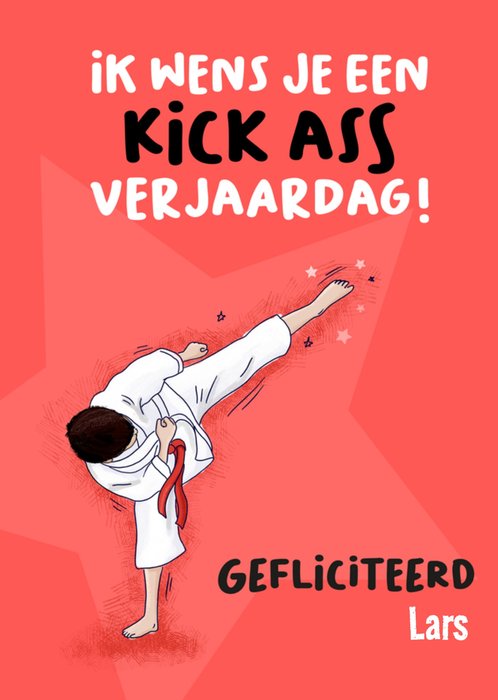 Grappige verjaardagskaart met judothema met de tekst: "Ik wens je een kick ass verjaardag! Gefeliciteerd Lars." Verras iemand met deze leuke Verjaardagskaart van Liefs Jansje.