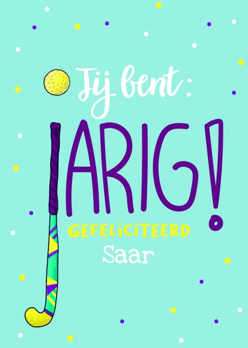 Grappige verjaardagskaart met hockeythema met de tekst: "Jij bent jarig! Gefeliciteerd Saar." Verras iemand met deze leuke Verjaardagskaart van Liefs Jansje.