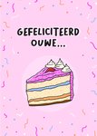 Grappige verjaardagskaart met een stukje taart en de tekst: 'Gefeliciteerd ouwe...'. Verras de jarige met deze kleurrijke verjaardagskaart van Liefs Jansje.